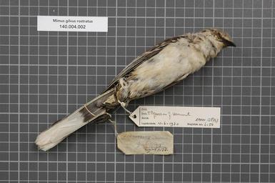 | Keywords: Naturalis Biodiversity Center - RMNH.AVES.128737 2 - Mimus gilvus rostratus Ridgway, 1884 - Mimidae - bird skin specimen.jpeg artwork Dimensions artwork Document type Mimidae Mimus Individual count 1 Infraspecific epithet rostratus Infraspecific rank Institution Naturalis Kind of unit artwork Kind of unit specimen skin Life stage Medium artwork Nomenclatural code Region remark on small label Benedenwindsche-Eil Occurrence ID page Other fields Other versions artwork Permission license Naturalis donation CC-0 Publication location Scientific name Mimus gilvus rostratus Ridgway 1884 Scientific name authorship Ridgway 1884 Source url http //bioportal naturalis nl Specific epithet gilvus State or province Curaτao Subject keywords artwork Subject keywords publication Title artwork Title publication Type status Uploaded with GWToolset Naturalis_Biodiversity_Center_-_RMNH AVES 128737_2_-_Mimus_gilvus_rostratus_Ridgway _1884_-_Mimidae_-_bird_skin_specimen http //medialib naturalis nl/file/id/RMNH AVES 128737_2/format/large Media donated by Naturalis Biodiversity Center Songbird specimens at Naturalis Biodiversity Center Mimus gilvus museum specimens |