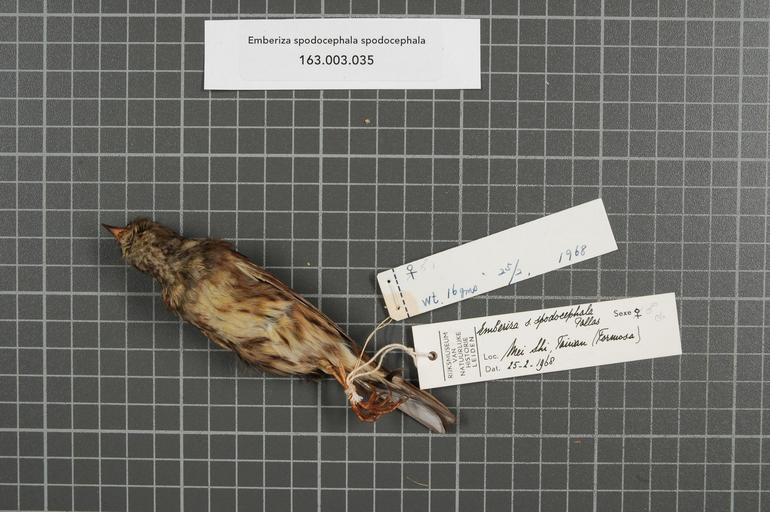 Keywords: Naturalis Biodiversity Center - RMNH.AVES.53368 2 - Emberiza spodocephala spodocephala Pallas, 1776 - Emberizidae - bird skin specimen.jpeg artwork Dimensions artwork Document type Emberizidae Emberiza Individual count 1 Infraspecific epithet spodocephala Infraspecific rank Institution Naturalis Kind of unit artwork Kind of unit specimen skin Life stage Taiwan Mei Chi Medium artwork Nomenclatural code Country remark On RMNH label Taiwan Formosa Sex remark On RMNH label female whipped out male GK Occurrence ID page Other fields Other versions artwork Permission license Naturalis donation CC-0 Publication location Scientific name Emberiza spodocephala spodocephala Pallas 1776 Scientific name authorship Pallas 1776 female Source url http //bioportal naturalis nl Specific epithet spodocephala State or province Subject keywords artwork Subject keywords publication Title artwork Title publication Type status Uploaded with GWToolset Naturalis_Biodiversity_Center_-_RMNH AVES 53368_2_-_Emberiza_spodocephala_spodocephala_Pallas _1776_-_Emberizidae_-_bird_skin_specimen http //medialib naturalis nl/file/id/RMNH AVES 53368_2/format/large Media donated by Naturalis Biodiversity Center Songbird specimens at Naturalis Biodiversity Center Emberiza spodocephala Emberiza