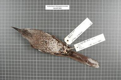 | Keywords: Naturalis Biodiversity Center - RMNH.AVES.54926 2 - Anthochaera chrysoptera lunulata (Gould, 1838) - Meliphagidae - bird skin specimen.jpeg artwork Dimensions artwork Document type Meliphagidae Anthochaera Individual count 1 Infraspecific epithet lunulata Infraspecific rank Institution Naturalis Kind of unit artwork Kind of unit specimen skin Life stage W Australiƫ Esperance Medium artwork Nomenclatural code Occurrence ID page Other fields Other versions artwork Permission license Naturalis donation CC-0 Publication location Scientific name Anthochaera chrysoptera lunulata Gould 1838 Scientific name authorship Gould 1838 male Source url http //bioportal naturalis nl Specific epithet chrysoptera State or province W Australiƫ Subject keywords artwork Subject keywords publication Title artwork Title publication Type status Uploaded with GWToolset Naturalis_Biodiversity_Center_-_RMNH AVES 54926_2_-_Anthochaera_chrysoptera_lunulata_ Gould _1838 _-_Meliphagidae_-_bird_skin_specimen http //medialib naturalis nl/file/id/RMNH AVES 54926_2/format/large Media donated by Naturalis Biodiversity Center Songbird specimens at Naturalis Biodiversity Center Anthochaera chrysoptera Anthochaera |