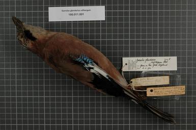 | Keywords: Naturalis Biodiversity Center - RMNH.AVES.56462 1 - Garrulus glandarius rufitergum Hartert, 1903 - Corvidae - bird skin specimen.jpeg artwork Dimensions artwork Document type Corvidae Garrulus Individual count 1 Infraspecific epithet rufitergum Infraspecific rank Institution Naturalis Kind of unit artwork Kind of unit specimen skin Life stage Engeland Yorks Yarm on Tees Medium artwork Nomenclatural code ADDITIONAL info remark first word unclear Occurrence ID page Other fields Other versions artwork Permission license Naturalis donation CC-0 Publication location Scientific name Garrulus glandarius rufitergum Hartert 1903 Scientific name authorship Hartert 1903 male Source url http //bioportal naturalis nl Specific epithet glandarius State or province Engeland Yorks Subject keywords artwork Subject keywords publication Title artwork Title publication Type status Uploaded with GWToolset Naturalis_Biodiversity_Center_-_RMNH AVES 56462_1_-_Garrulus_glandarius_rufitergum_Hartert _1903_-_Corvidae_-_bird_skin_specimen http //medialib naturalis nl/file/id/RMNH AVES 56462_1/format/large Media donated by Naturalis Biodiversity Center Songbird specimens at Naturalis Biodiversity Center Garrulus glandarius Garrulus |