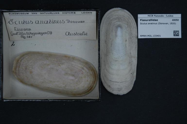 | Keywords: Naturalis Biodiversity Center - RMNH.MOL.133401 - Scutus anatinus (Donovan, 1820) - Fissurellidae - Mollusc shell.jpeg artwork Dimensions artwork Document type Fissurellidae subfamily Emarginulinae Scutus Individual count Infraspecific epithet Infraspecific rank Institution Naturalis Kind of unit artwork Kind of unit specimen shell Life stage Medium artwork Nomenclatural code Source institute Leiden Scale the width of the text on the species/QR-code label is 38 mm Occurrence ID page Other fields Other versions artwork Permission license Naturalis donation CC-0 Mollusca Publication location Scientific name Scutus anatinus Donovan 1820 Scientific name authorship Donovan 1820 Source url http //bioportal naturalis nl Specific epithet anatinus State or province Subject keywords artwork Subject keywords publication Title artwork Title publication Type status Uploaded with GWToolset Naturalis_Biodiversity_Center_-_RMNH MOL 133401_-_Scutus_anatinus_ Donovan _1820 _-_Fissurellidae_-_Mollusc_shell http //medialib naturalis nl/file/id/RMNH MOL 133401/format/large Molluscs at Naturalis from the Rijksmuseum van Natuurlijke Historie Media donated by Naturalis Biodiversity Center Scutus Scutus anatinus |