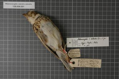 | Keywords: Naturalis Biodiversity Center - RMNH.AVES.57384 1 - Melanocorypha calandra calandra (Linnaeus, 1766) - Alaudidae - bird skin specimen.jpeg artwork Dimensions artwork Document type Alaudidae Melanocorypha Individual count 1 Infraspecific epithet calandra Infraspecific rank Institution Naturalis Kind of unit artwork Kind of unit specimen skin Life stage juvenile Italiƫ Puglia Foggia Medium artwork Nomenclatural code Occurrence ID page Other fields Other versions artwork Permission license Naturalis donation CC-0 Publication location Scientific name Melanocorypha calandra calandra Linnaeus 1766 Scientific name authorship Linnaeus 1766 male Source url http //bioportal naturalis nl Specific epithet calandra State or province Puglia Subject keywords artwork Subject keywords publication Title artwork Title publication Type status Uploaded with GWToolset Naturalis_Biodiversity_Center_-_RMNH AVES 57384_1_-_Melanocorypha_calandra_calandra_ Linnaeus _1766 _-_Alaudidae_-_bird_skin_specimen http //medialib naturalis nl/file/id/RMNH AVES 57384_1/format/large Media donated by Naturalis Biodiversity Center Songbird specimens at Naturalis Biodiversity Center Melanocorypha calandra Melanocorypha |