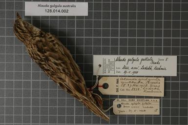 | Keywords: Naturalis Biodiversity Center - RMNH.AVES.57448 1 - Alauda gulgula australis Brooks, 1873 - Alaudidae - bird skin specimen.jpeg artwork Dimensions artwork Document type Alaudidae Alauda Individual count 1 Infraspecific epithet australis Infraspecific rank Institution Naturalis Kind of unit artwork Kind of unit specimen skin Life stage Kashmir Dras Ladakh Medium artwork Nomenclatural code Occurrence ID page Other fields Other versions artwork Permission license Naturalis donation CC-0 Publication location Scientific name Alauda gulgula australis Brooks 1873 Scientific name authorship Brooks 1873 male Source url http //bioportal naturalis nl Specific epithet gulgula State or province Kashmir Subject keywords artwork Subject keywords publication Title artwork Title publication Type status Uploaded with GWToolset Naturalis_Biodiversity_Center_-_RMNH AVES 57448_1_-_Alauda_gulgula_australis_Brooks _1873_-_Alaudidae_-_bird_skin_specimen http //medialib naturalis nl/file/id/RMNH AVES 57448_1/format/large Media donated by Naturalis Biodiversity Center Songbird specimens at Naturalis Biodiversity Center Alauda gulgula Alauda |