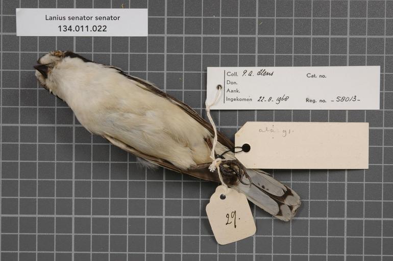 | Keywords: Naturalis Biodiversity Center - RMNH.AVES.58013 2 - Lanius senator senator Linnaeus, 1758 - Laniidae - bird skin specimen.jpeg artwork Dimensions artwork Document type Laniidae Lanius Individual count 1 Infraspecific epithet senator Infraspecific rank Institution Naturalis Kind of unit artwork Kind of unit specimen skin Life stage Portugal bij Setubal Z van Lissabon Medium artwork Nomenclatural code Occurrence ID page Other fields Other versions artwork Permission license Naturalis donation CC-0 Publication location Scientific name Lanius senator senator Linnaeus 1758 Scientific name authorship Linnaeus 1758 male Source url http //bioportal naturalis nl Specific epithet senator State or province Subject keywords artwork Subject keywords publication Title artwork Title publication Type status Uploaded with GWToolset Naturalis_Biodiversity_Center_-_RMNH AVES 58013_2_-_Lanius_senator_senator_Linnaeus _1758_-_Laniidae_-_bird_skin_specimen http //medialib naturalis nl/file/id/RMNH AVES 58013_2/format/large Media donated by Naturalis Biodiversity Center Songbird specimens at Naturalis Biodiversity Center Lanius senator Lanius |