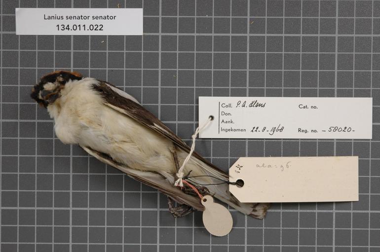 | Keywords: Naturalis Biodiversity Center - RMNH.AVES.58020 2 - Lanius senator senator Linnaeus, 1758 - Laniidae - bird skin specimen.jpeg artwork Dimensions artwork Document type Laniidae Lanius Individual count 1 Infraspecific epithet senator Infraspecific rank Institution Naturalis Kind of unit artwork Kind of unit specimen skin Life stage Portugal bij Setubal Z van Lissabon Medium artwork Nomenclatural code Occurrence ID page Other fields Other versions artwork Permission license Naturalis donation CC-0 Publication location Scientific name Lanius senator senator Linnaeus 1758 Scientific name authorship Linnaeus 1758 male Source url http //bioportal naturalis nl Specific epithet senator State or province Subject keywords artwork Subject keywords publication Title artwork Title publication Type status Uploaded with GWToolset Naturalis_Biodiversity_Center_-_RMNH AVES 58020_2_-_Lanius_senator_senator_Linnaeus _1758_-_Laniidae_-_bird_skin_specimen http //medialib naturalis nl/file/id/RMNH AVES 58020_2/format/large Media donated by Naturalis Biodiversity Center Songbird specimens at Naturalis Biodiversity Center Lanius senator Lanius |