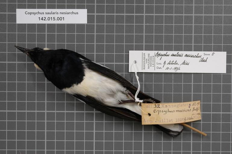 | Keywords: Naturalis Biodiversity Center - RMNH.AVES.129346 1 - Copsychus saularis nesiarchus Oberholser, 1923 - Turdidae - bird skin specimen.jpeg artwork Dimensions artwork Document type Turdidae Copsychus Individual count 1 Infraspecific epithet nesiarchus Infraspecific rank Institution Naturalis Kind of unit artwork Kind of unit specimen skin Life stage Medium artwork Nomenclatural code Occurrence ID page Other fields Other versions artwork Permission license Naturalis donation CC-0 Publication location Scientific name Copsychus saularis nesiarchus Oberholser 1923 Scientific name authorship Oberholser 1923 male Source url http //bioportal naturalis nl Specific epithet saularis State or province Nias Subject keywords artwork Subject keywords publication Title artwork Title publication Type status Uploaded with GWToolset Naturalis_Biodiversity_Center_-_RMNH AVES 129346_1_-_Copsychus_saularis_nesiarchus_Oberholser _1923_-_Turdidae_-_bird_skin_specimen http //medialib naturalis nl/file/id/RMNH AVES 129346_1/format/large Media donated by Naturalis Biodiversity Center Songbird specimens at Naturalis Biodiversity Center Copsychus saularis museum specimens |