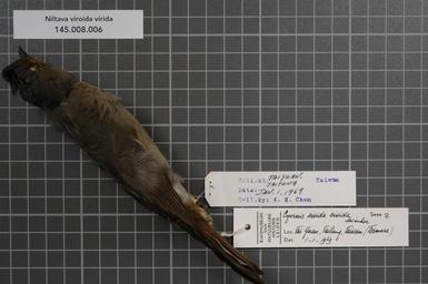 | Keywords: Naturalis Biodiversity Center - RMNH.AVES.58931 1- - Niltava vivida vivida (Swinhoe, 1864) - Muscicapidae - bird skin specimen.jpeg artwork Dimensions artwork Document type Muscicapidae Niltava Individual count 1 Infraspecific epithet vivida Infraspecific rank Institution Naturalis Kind of unit artwork Kind of unit specimen skin Life stage Taiwan Taitung Tai Yuan Medium artwork Nomenclatural code General remarks Species name label in top left corner Niltava viroida virida 145 008 006 contains errors Correct name is Niltava vividvivida Label Chen also contains some text in Japanese / Tiwanese Country remark on label Taiwan Formosa Occurrence ID page Other fields Other versions artwork Permission license Naturalis donation CC-0 Publication location Scientific name Niltava vivida vivida Swinhoe 1864 Scientific name authorship Swinhoe 1864 female Source url http //bioportal naturalis nl Specific epithet vivida State or province Subject keywords artwork Subject keywords publication Title artwork Title publication Type status Uploaded with GWToolset Naturalis_Biodiversity_Center_-_RMNH AVES 58931_1 _-_Niltava_vivida_vivida_ Swinhoe _1864 _-_Muscicapidae_-_bird_skin_specimen http //medialib naturalis nl/file/id/RMNH AVES 58931_1/format/large Media donated by Naturalis Biodiversity Center Songbird specimens at Naturalis Biodiversity Center Niltava vivida museum specimens |