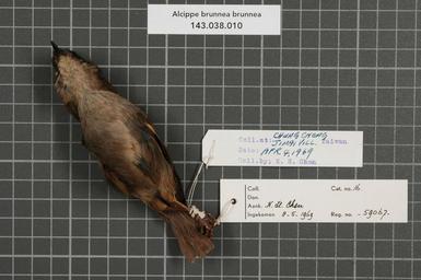 | Keywords: Naturalis Biodiversity Center - RMNH.AVES.59067 2- - Alcippe brunnea brunnea Gould, 1863 - Timaliidae - bird skin specimen.jpeg artwork Dimensions artwork Document type Timaliidae Alcippe Individual count 1 Infraspecific epithet brunnea Infraspecific rank Institution Naturalis Kind of unit artwork Kind of unit specimen skin Life stage Taiwan Jinai Vill Chung Cheng Medium artwork Nomenclatural code General remarks Label Chen also contains some text in Japanese / Tiwanese Country remark on label RMNH Taiwan Formosa Occurrence ID page Other fields Other versions artwork Permission license Naturalis donation CC-0 Publication location Scientific name Alcippe brunnea brunnea Gould 1863 Scientific name authorship Gould 1863 male Source url http //bioportal naturalis nl Specific epithet brunnea State or province Subject keywords artwork Subject keywords publication Title artwork Title publication Type status Uploaded with GWToolset Naturalis_Biodiversity_Center_-_RMNH AVES 59067_2 _-_Alcippe_brunnea_brunnea_Gould _1863_-_Timaliidae_-_bird_skin_specimen http //medialib naturalis nl/file/id/RMNH AVES 59067_2/format/large Media donated by Naturalis Biodiversity Center Songbird specimens at Naturalis Biodiversity Center Alcippe brunnea Alcippe |
