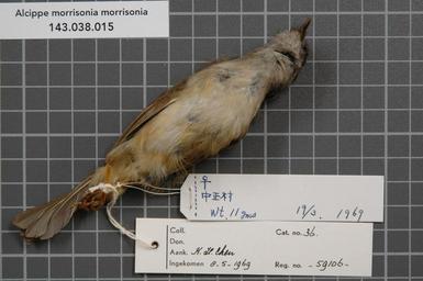 | Keywords: Naturalis Biodiversity Center - RMNH.AVES.59106 2- - Alcippe morrisonia morrisonia Swinhoe, 1863 - Timaliidae - bird skin specimen.jpeg artwork Dimensions artwork Document type Timaliidae Alcippe Individual count 1 Infraspecific epithet morrisonia Infraspecific rank Institution Naturalis Kind of unit artwork Kind of unit specimen skin Life stage Taiwan Chung Cheng Jinai Vill Medium artwork Nomenclatural code General remarks Label Chen also contains some text in Japanese / Tiwanese Country remark On RMNH label Taiwan Formosa Occurrence ID page Other fields Other versions artwork Permission license Naturalis donation CC-0 Publication location Scientific name Alcippe morrisonia morrisonia Swinhoe 1863 Scientific name authorship Swinhoe 1863 female Source url http //bioportal naturalis nl Specific epithet morrisonia State or province Subject keywords artwork Subject keywords publication Title artwork Title publication Type status Uploaded with GWToolset Naturalis_Biodiversity_Center_-_RMNH AVES 59106_2 _-_Alcippe_morrisonia_morrisonia_Swinhoe _1863_-_Timaliidae_-_bird_skin_specimen http //medialib naturalis nl/file/id/RMNH AVES 59106_2/format/large Media donated by Naturalis Biodiversity Center Songbird specimens at Naturalis Biodiversity Center Alcippe morrisonia Alcippe |
