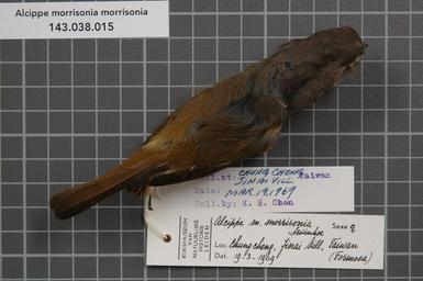 | Keywords: Naturalis Biodiversity Center - RMNH.AVES.59107 1- - Alcippe morrisonia morrisonia Swinhoe, 1863 - Timaliidae - bird skin specimen.jpeg artwork Dimensions artwork Document type Timaliidae Alcippe Individual count 1 Infraspecific epithet morrisonia Infraspecific rank Institution Naturalis Kind of unit artwork Kind of unit specimen skin Life stage Taiwan Chung Cheng Jinai Vill Medium artwork Nomenclatural code General remarks Label Chen also contains some text in Japanese / Tiwanese Country remark On RMNH label Taiwan Formosa Occurrence ID page Other fields Other versions artwork Permission license Naturalis donation CC-0 Publication location Scientific name Alcippe morrisonia morrisonia Swinhoe 1863 Scientific name authorship Swinhoe 1863 female Source url http //bioportal naturalis nl Specific epithet morrisonia State or province Subject keywords artwork Subject keywords publication Title artwork Title publication Type status Uploaded with GWToolset Naturalis_Biodiversity_Center_-_RMNH AVES 59107_1 _-_Alcippe_morrisonia_morrisonia_Swinhoe _1863_-_Timaliidae_-_bird_skin_specimen http //medialib naturalis nl/file/id/RMNH AVES 59107_1/format/large Media donated by Naturalis Biodiversity Center Songbird specimens at Naturalis Biodiversity Center Alcippe morrisonia Alcippe |