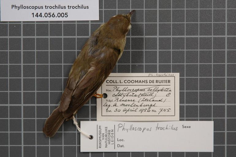 | Keywords: Naturalis Biodiversity Center - RMNH.AVES.60789 1 - Phylloscopus trochilus trochilus (Linnaeus, 1758) - Sylviidae - bird skin specimen.jpeg artwork Dimensions artwork Document type Sylviidae Phylloscopus Individual count 1 Infraspecific epithet trochilus Infraspecific rank Institution Naturalis Kind of unit artwork Kind of unit specimen skin Life stage Zeeland Renesse Medium artwork Nomenclatural code Bodily condition Onderhuids normaal Gedeeltelijk bedorven aangekomen ADDITIONAL preparation info P Graat v/h Zoöl Mus te Amsterdam Occurrence ID page Other fields Other versions artwork Permission license Naturalis donation CC-0 Publication location Scientific name Phylloscopus trochilus trochilus Linnaeus 1758 Scientific name authorship Linnaeus 1758 male Source url http //bioportal naturalis nl Specific epithet trochilus State or province Zeeland Subject keywords artwork Subject keywords publication Title artwork Title publication Type status Uploaded with GWToolset Naturalis_Biodiversity_Center_-_RMNH AVES 60789_1_-_Phylloscopus_trochilus_trochilus_ Linnaeus _1758 _-_Sylviidae_-_bird_skin_specimen http //medialib naturalis nl/file/id/RMNH AVES 60789_1/format/large Media donated by Naturalis Biodiversity Center Songbird specimens at Naturalis Biodiversity Center Phylloscopus trochilus Phylloscopus |