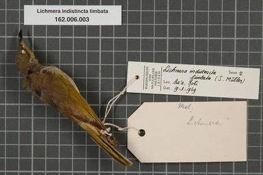 | Keywords: Naturalis Biodiversity Center - RMNH.AVES.65554 1 - Lichmera indistincta limbata (S. Muller, 1843) - Meliphagidae - bird skin specimen.jpeg artwork Dimensions artwork Document type Meliphagidae Lichmera Individual count 1 Infraspecific epithet limbata Infraspecific rank Institution Naturalis Kind of unit artwork Kind of unit specimen skin Life stage Roti Ba'a Medium artwork Nomenclatural code Occurrence ID page Other fields Other versions artwork Permission license Naturalis donation CC-0 Publication location Scientific name Lichmera indistincta limbata S Muller 1843 Scientific name authorship S Müller 1843 female Source url http //bioportal naturalis nl Specific epithet indistincta State or province Roti Subject keywords artwork Subject keywords publication Title artwork Title publication Type status Uploaded with GWToolset Naturalis_Biodiversity_Center_-_RMNH AVES 65554_1_-_Lichmera_indistincta_limbata_ S _Muller _1843 _-_Meliphagidae_-_bird_skin_specimen http //medialib naturalis nl/file/id/RMNH AVES 65554_1/format/large Media donated by Naturalis Biodiversity Center Songbird specimens at Naturalis Biodiversity Center Lichmera indistincta Lichmera |