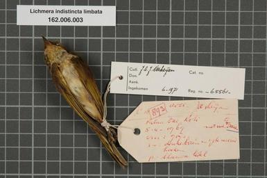 | Keywords: Naturalis Biodiversity Center - RMNH.AVES.65561 2 - Lichmera indistincta limbata (S. Muller, 1843) - Meliphagidae - bird skin specimen.jpeg artwork Dimensions artwork Document type Meliphagidae Lichmera Individual count 1 Infraspecific epithet limbata Infraspecific rank Institution Naturalis Kind of unit artwork Kind of unit specimen skin Life stage Roti Palau Dao Medium artwork Nomenclatural code Occurrence ID page Other fields Other versions artwork Permission license Naturalis donation CC-0 Publication location Scientific name Lichmera indistincta limbata S Muller 1843 Scientific name authorship S Müller 1843 female Source url http //bioportal naturalis nl Specific epithet indistincta State or province Roti Subject keywords artwork Subject keywords publication Title artwork Title publication Type status Uploaded with GWToolset Naturalis_Biodiversity_Center_-_RMNH AVES 65561_2_-_Lichmera_indistincta_limbata_ S _Muller _1843 _-_Meliphagidae_-_bird_skin_specimen http //medialib naturalis nl/file/id/RMNH AVES 65561_2/format/large Media donated by Naturalis Biodiversity Center Songbird specimens at Naturalis Biodiversity Center Lichmera indistincta Lichmera |