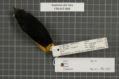 | Keywords: Naturalis Biodiversity Center - RMNH.AVES.86175 2 - Euplectes afer taha A. Smith, 1836 - Ploceidae - bird skin specimen.jpeg artwork Dimensions artwork Document type Ploceidae Euplectes Individual count 1 Infraspecific epithet taha Infraspecific rank Institution Naturalis Kind of unit artwork Kind of unit specimen skin Life stage adult South Africa Natal Klip River Ladysmith Medium artwork Nomenclatural code Occurrence ID page Other fields Other versions artwork Permission license Naturalis donation CC-0 Publication location Scientific name Euplectes afer taha A Smith 1836 Scientific name authorship A Smith 1836 male Source url http //bioportal naturalis nl Specific epithet afer State or province Natal Subject keywords artwork Subject keywords publication Title artwork Title publication Type status Uploaded with GWToolset Naturalis_Biodiversity_Center_-_RMNH AVES 86175_2_-_Euplectes_afer_taha_A _Smith _1836_-_Ploceidae_-_bird_skin_specimen http //medialib naturalis nl/file/id/RMNH AVES 86175_2/format/large Media donated by Naturalis Biodiversity Center Songbird specimens at Naturalis Biodiversity Center Euplectes afer |