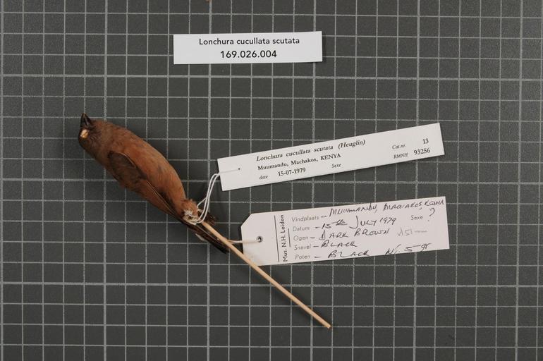 | Keywords: Naturalis Biodiversity Center - RMNH.AVES.93256 1 - Lonchura cucullata scutata (Heuglin, 1863) - Estrildidae - bird skin specimen.jpeg artwork Dimensions artwork Document type Estrildidae Lonchura Individual count 1 Infraspecific epithet scutata Infraspecific rank Institution Naturalis Kind of unit artwork Kind of unit specimen skin Life stage Kenya Machakos Muumandu Medium artwork Nomenclatural code Sex remark on original label Sexe Occurrence ID page Other fields Other versions artwork Permission license Naturalis donation CC-0 Publication location Scientific name Lonchura cucullata scutata Heuglin 1863 Scientific name authorship Heuglin 1863 Source url http //bioportal naturalis nl Specific epithet cucullata State or province Machakos Subject keywords artwork Subject keywords publication Title artwork Title publication Type status Uploaded with GWToolset Naturalis_Biodiversity_Center_-_RMNH AVES 93256_1_-_Lonchura_cucullata_scutata_ Heuglin _1863 _-_Estrildidae_-_bird_skin_specimen http //medialib naturalis nl/file/id/RMNH AVES 93256_1/format/large Media donated by Naturalis Biodiversity Center Songbird specimens at Naturalis Biodiversity Center Lonchura cucullata museum specimens |