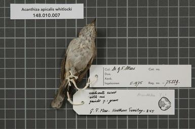 | Keywords: Naturalis Biodiversity Center - RMNH.AVES.75229 2 - Acanthiza apicalis whitlocki North, 1909 - Acanthizidae - bird skin specimen.jpeg artwork Dimensions artwork Document type Acanthizidae Acanthiza Individual count 1 Infraspecific epithet whitlocki Infraspecific rank Institution Naturalis Kind of unit artwork Kind of unit specimen skin Life stage Australiƫ Northern Territory Tennant Creek Cabbage Gum Bore Medium artwork Nomenclatural code Occurrence ID page Other fields Other versions artwork Permission license Naturalis donation CC-0 Publication location Scientific name Acanthiza apicalis whitlocki North 1909 Scientific name authorship North 1909 male Source url http //bioportal naturalis nl Specific epithet apicalis State or province Northern Territory Subject keywords artwork Subject keywords publication Title artwork Title publication Type status Uploaded with GWToolset Naturalis_Biodiversity_Center_-_RMNH AVES 75229_2_-_Acanthiza_apicalis_whitlocki_North _1909_-_Acanthizidae_-_bird_skin_specimen http //medialib naturalis nl/file/id/RMNH AVES 75229_2/format/large Media donated by Naturalis Biodiversity Center Songbird specimens at Naturalis Biodiversity Center Acanthiza apicalis museum specimens |