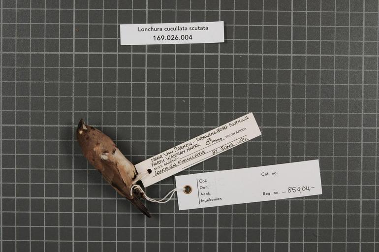 | Keywords: Naturalis Biodiversity Center - RMNH.AVES.85904 1 - Lonchura cucullata scutata (Heuglin, 1863) - Estrildidae - bird skin specimen.jpeg artwork Dimensions artwork Document type Estrildidae Lonchura Individual count 1 Infraspecific epithet scutata Infraspecific rank Institution Naturalis Kind of unit artwork Kind of unit specimen skin Life stage immature South Africa North Western Natal Drakensberg Foothillls near van Reenen Medium artwork Nomenclatural code Occurrence ID page Other fields Other versions artwork Permission license Naturalis donation CC-0 Publication location Scientific name Lonchura cucullata scutata Heuglin 1863 Scientific name authorship Heuglin 1863 male Source url http //bioportal naturalis nl Specific epithet cucullata State or province North Western Natal Drakensberg Foothillls near van Reenen Subject keywords artwork Subject keywords publication Title artwork Title publication Type status Uploaded with GWToolset Naturalis_Biodiversity_Center_-_RMNH AVES 85904_1_-_Lonchura_cucullata_scutata_ Heuglin _1863 _-_Estrildidae_-_bird_skin_specimen http //medialib naturalis nl/file/id/RMNH AVES 85904_1/format/large Media donated by Naturalis Biodiversity Center Songbird specimens at Naturalis Biodiversity Center Lonchura cucullata museum specimens |