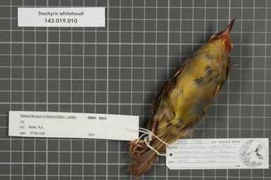 | Keywords: Naturalis Biodiversity Center - RMNH.AVES.99816 2 - Stachyris whiteheadi (Ogilvie-Grant, 1894) - Timaliidae - bird skin specimen.jpeg artwork Dimensions artwork Document type Timaliidae Stachyris Individual count 1 Infraspecific epithet Infraspecific rank Institution Naturalis Kind of unit artwork Kind of unit specimen skin Life stage Philippines Luzon ID Camarines Sur Prov Pili Curry Mt Isarog Medium artwork Nomenclatural code Occurrence ID page Other fields Other versions artwork Permission license Naturalis donation CC-0 Publication location Scientific name Stachyris whiteheadi Ogilvie-Grant 1894 Scientific name authorship Ogilvie-Grant 1894 male Source url http //bioportal naturalis nl Specific epithet whiteheadi State or province Luzon ID Camarines Sur Prov Pili Curry Subject keywords artwork Subject keywords publication Title artwork Title publication Type status Uploaded with GWToolset Naturalis_Biodiversity_Center_-_RMNH AVES 99816_2_-_Stachyris_whiteheadi_ Ogilvie-Grant _1894 _-_Timaliidae_-_bird_skin_specimen http //medialib naturalis nl/file/id/RMNH AVES 99816_2/format/large Media donated by Naturalis Biodiversity Center Songbird specimens at Naturalis Biodiversity Center Zosterornis whiteheadi |