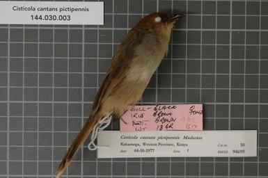 | Keywords: Naturalis Biodiversity Center - RMNH.AVES.94699 1 - Cisticola cantans pictipennis Madarász, 1904 - Sylviidae - bird skin specimen.jpeg artwork Dimensions artwork Document type Sylviidae Cisticola Individual count 1 Infraspecific epithet pictipennis Infraspecific rank Institution Naturalis Kind of unit artwork Kind of unit specimen skin Life stage Kenya Western Prov Kakamega Forest Medium artwork Nomenclatural code Occurrence ID page Other fields Other versions artwork Permission license Naturalis donation CC-0 Publication location Scientific name Cisticola cantans pictipennis Madarász 1904 Scientific name authorship Madarász 1904 female Source url http //bioportal naturalis nl Specific epithet cantans State or province Western Prov Kakamega Forest Subject keywords artwork Subject keywords publication Title artwork Title publication Type status Uploaded with GWToolset Naturalis_Biodiversity_Center_-_RMNH AVES 94699_1_-_Cisticola_cantans_pictipennis_Madarász _1904_-_Sylviidae_-_bird_skin_specimen http //medialib naturalis nl/file/id/RMNH AVES 94699_1/format/large Media donated by Naturalis Biodiversity Center Songbird specimens at Naturalis Biodiversity Center Cisticola cantans museum specimens |
