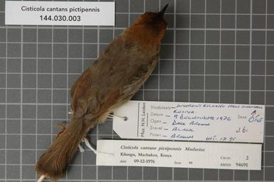 | Keywords: Naturalis Biodiversity Center - RMNH.AVES.94691 1 - Cisticola cantans pictipennis Madarász, 1904 - Sylviidae - bird skin specimen.jpeg artwork Dimensions artwork Document type Sylviidae Cisticola Individual count 1 Infraspecific epithet pictipennis Infraspecific rank Institution Naturalis Kind of unit artwork Kind of unit specimen skin Life stage Kenya Machakos Kilungu Hills Inyokoni Medium artwork Nomenclatural code Occurrence ID page Other fields Other versions artwork Permission license Naturalis donation CC-0 Publication location Scientific name Cisticola cantans pictipennis Madarász 1904 Scientific name authorship Madarász 1904 male Source url http //bioportal naturalis nl Specific epithet cantans State or province Machakos Kilungu Hills Subject keywords artwork Subject keywords publication Title artwork Title publication Type status Uploaded with GWToolset Naturalis_Biodiversity_Center_-_RMNH AVES 94691_1_-_Cisticola_cantans_pictipennis_Madarász _1904_-_Sylviidae_-_bird_skin_specimen http //medialib naturalis nl/file/id/RMNH AVES 94691_1/format/large Media donated by Naturalis Biodiversity Center Songbird specimens at Naturalis Biodiversity Center Cisticola cantans museum specimens |