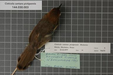 | Keywords: Naturalis Biodiversity Center - RMNH.AVES.94695 1 - Cisticola cantans pictipennis Madarász, 1904 - Sylviidae - bird skin specimen.jpeg artwork Dimensions artwork Document type Sylviidae Cisticola Individual count 1 Infraspecific epithet pictipennis Infraspecific rank Institution Naturalis Kind of unit artwork Kind of unit specimen skin Life stage Kenya Machakos Kilungu Hills Kikoko Medium artwork Nomenclatural code Occurrence ID page Other fields Other versions artwork Permission license Naturalis donation CC-0 Publication location Scientific name Cisticola cantans pictipennis Madarász 1904 Scientific name authorship Madarász 1904 male Source url http //bioportal naturalis nl Specific epithet cantans State or province Machakos Kilungu Hills Subject keywords artwork Subject keywords publication Title artwork Title publication Type status Uploaded with GWToolset Naturalis_Biodiversity_Center_-_RMNH AVES 94695_1_-_Cisticola_cantans_pictipennis_Madarász _1904_-_Sylviidae_-_bird_skin_specimen http //medialib naturalis nl/file/id/RMNH AVES 94695_1/format/large Media donated by Naturalis Biodiversity Center Songbird specimens at Naturalis Biodiversity Center Cisticola cantans museum specimens |