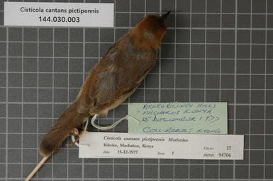 | Keywords: Naturalis Biodiversity Center - RMNH.AVES.94706 1 - Cisticola cantans pictipennis Madarász, 1904 - Sylviidae - bird skin specimen.jpeg artwork Dimensions artwork Document type Sylviidae Cisticola Individual count 1 Infraspecific epithet pictipennis Infraspecific rank Institution Naturalis Kind of unit artwork Kind of unit specimen skin Life stage Kenya Machakos Kilungu Hills Kikoko Medium artwork Nomenclatural code Occurrence ID page Other fields Other versions artwork Permission license Naturalis donation CC-0 Publication location Scientific name Cisticola cantans pictipennis Madarász 1904 Scientific name authorship Madarász 1904 female Source url http //bioportal naturalis nl Specific epithet cantans State or province Machakos Kilungu Hills Subject keywords artwork Subject keywords publication Title artwork Title publication Type status Uploaded with GWToolset Naturalis_Biodiversity_Center_-_RMNH AVES 94706_1_-_Cisticola_cantans_pictipennis_Madarász _1904_-_Sylviidae_-_bird_skin_specimen http //medialib naturalis nl/file/id/RMNH AVES 94706_1/format/large Media donated by Naturalis Biodiversity Center Songbird specimens at Naturalis Biodiversity Center Cisticola cantans museum specimens |