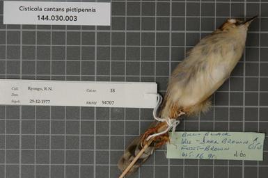 | Keywords: Naturalis Biodiversity Center - RMNH.AVES.94707 2 - Cisticola cantans pictipennis Madarász, 1904 - Sylviidae - bird skin specimen.jpeg artwork Dimensions artwork Document type Sylviidae Cisticola Individual count 1 Infraspecific epithet pictipennis Infraspecific rank Institution Naturalis Kind of unit artwork Kind of unit specimen skin Life stage Kenya Machakos Kilungu Hills Kikoko Medium artwork Nomenclatural code Occurrence ID page Other fields Other versions artwork Permission license Naturalis donation CC-0 Publication location Scientific name Cisticola cantans pictipennis Madarász 1904 Scientific name authorship Madarász 1904 male Source url http //bioportal naturalis nl Specific epithet cantans State or province Machakos Kilungu Hills Subject keywords artwork Subject keywords publication Title artwork Title publication Type status Uploaded with GWToolset Naturalis_Biodiversity_Center_-_RMNH AVES 94707_2_-_Cisticola_cantans_pictipennis_Madarász _1904_-_Sylviidae_-_bird_skin_specimen http //medialib naturalis nl/file/id/RMNH AVES 94707_2/format/large Media donated by Naturalis Biodiversity Center Songbird specimens at Naturalis Biodiversity Center Cisticola cantans museum specimens |