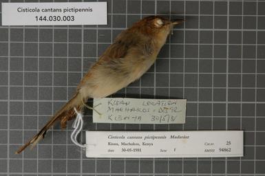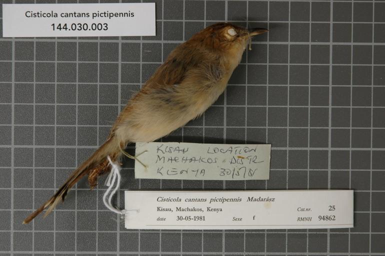 | Keywords: Naturalis Biodiversity Center - RMNH.AVES.94862 1 - Cisticola cantans pictipennis Madarász, 1904 - Sylviidae - bird skin specimen.jpeg artwork Dimensions artwork Document type Sylviidae Cisticola Individual count 1 Infraspecific epithet pictipennis Infraspecific rank Institution Naturalis Kind of unit artwork Kind of unit specimen skin Life stage Kenya Machakos Distr Kisau Medium artwork Nomenclatural code Occurrence ID page Other fields Other versions artwork Permission license Naturalis donation CC-0 Publication location Scientific name Cisticola cantans pictipennis Madarász 1904 Scientific name authorship Madarász 1904 female Source url http //bioportal naturalis nl Specific epithet cantans State or province Machakos Distr Subject keywords artwork Subject keywords publication Title artwork Title publication Type status Uploaded with GWToolset Naturalis_Biodiversity_Center_-_RMNH AVES 94862_1_-_Cisticola_cantans_pictipennis_Madarász _1904_-_Sylviidae_-_bird_skin_specimen http //medialib naturalis nl/file/id/RMNH AVES 94862_1/format/large Media donated by Naturalis Biodiversity Center Songbird specimens at Naturalis Biodiversity Center Cisticola cantans museum specimens |