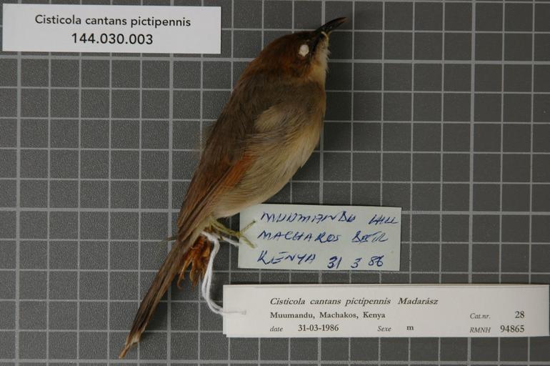 | Keywords: Naturalis Biodiversity Center - RMNH.AVES.94865 1 - Cisticola cantans pictipennis Madarász, 1904 - Sylviidae - bird skin specimen.jpeg artwork Dimensions artwork Document type Sylviidae Cisticola Individual count 1 Infraspecific epithet pictipennis Infraspecific rank Institution Naturalis Kind of unit artwork Kind of unit specimen skin Life stage Kenya Machakos distr Muumandu Hill Medium artwork Nomenclatural code Occurrence ID page Other fields Other versions artwork Permission license Naturalis donation CC-0 Publication location Scientific name Cisticola cantans pictipennis Madarász 1904 Scientific name authorship Madarász 1904 male Source url http //bioportal naturalis nl Specific epithet cantans State or province Machakos distr Subject keywords artwork Subject keywords publication Title artwork Title publication Type status Uploaded with GWToolset Naturalis_Biodiversity_Center_-_RMNH AVES 94865_1_-_Cisticola_cantans_pictipennis_Madarász _1904_-_Sylviidae_-_bird_skin_specimen http //medialib naturalis nl/file/id/RMNH AVES 94865_1/format/large Media donated by Naturalis Biodiversity Center Songbird specimens at Naturalis Biodiversity Center Cisticola cantans museum specimens |
