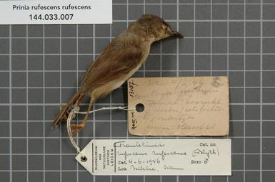 | Keywords: Naturalis Biodiversity Center - RMNH.AVES.13107 1 - Prinia rufescens rufescens Blyth, 1847 - Sylviidae - bird skin specimen.jpeg artwork Dimensions artwork Document type Sylviidae Prinia Individual count 1 Infraspecific epithet rufescens Infraspecific rank Institution Naturalis Kind of unit artwork Kind of unit specimen skin Life stage Medium artwork Nomenclatural code Locality remark On field label Nike On RMNH label Nikke Occurrence ID page Other fields Other versions artwork Permission license Naturalis donation CC-0 Publication location Scientific name Prinia rufescens rufescens Blyth 1847 Scientific name authorship Blyth 1847 male Source url http //bioportal naturalis nl Specific epithet rufescens State or province Subject keywords artwork Subject keywords publication Title artwork Title publication Type status Uploaded with GWToolset Naturalis_Biodiversity_Center_-_RMNH AVES 13107_1_-_Prinia_rufescens_rufescens_Blyth _1847_-_Sylviidae_-_bird_skin_specimen http //medialib naturalis nl/file/id/RMNH AVES 13107_1/format/large Media donated by Naturalis Biodiversity Center Songbird specimens at Naturalis Biodiversity Center Prinia rufescens Prinia |