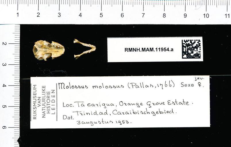 | Keywords: Naturalis Biodiversity Center - RMNH.MAM.11954.a pal - Molossus molossus - skull.jpeg artwork Dimensions artwork Document type Molossus Individual count 1 Infraspecific epithet Infraspecific rank Institution Naturalis Kind of unit artwork Kind of unit specimen skull Life stage juvenile Orange Grove Estate Tacarigua Trinidad Caraibisch-gebied Medium artwork Nomenclatural code Occurrence ID page Other fields Other versions artwork Permission license Naturalis donation CC-0 Publication location Scientific name Molossus molossus Scientific name authorship female Source url http //bioportal naturalis nl Specific epithet molossus State or province Subject keywords artwork Subject keywords publication Title artwork Title publication Type status Uploaded with GWToolset Naturalis_Biodiversity_Center_-_RMNH MAM 11954 a_pal_-_Molossus_molossus_-_skull http //medialib naturalis nl/file/id/RMNH MAM 11954 a_pal/format/large Media donated by Naturalis Biodiversity Center Mammals at Naturalis from the Rijksmuseum van Natuurlijke Historie Molossus molossus |