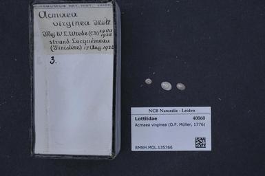 | Keywords: Naturalis Biodiversity Center - RMNH.MOL.135766 - Tectura virginea (Müller, 1776) - Lottiidae - Mollusc shell.jpeg artwork Dimensions artwork Document type Lottiidae Tectura Individual count Infraspecific epithet Infraspecific rank Institution Naturalis Kind of unit artwork Kind of unit specimen shell Life stage Medium artwork Nomenclatural code Source institute Leiden Scale the width of the text on the species/QR-code label is 38 mm Occurrence ID page Other fields Other versions artwork Permission license Naturalis donation CC-0 Mollusca Publication location Scientific name Tectura virginea Müller 1776 Scientific name authorship Müller 1776 Source url http //bioportal naturalis nl Specific epithet virginea State or province Subject keywords artwork Subject keywords publication Title artwork Title publication Type status Uploaded with GWToolset Naturalis_Biodiversity_Center_-_RMNH MOL 135766_-_Tectura_virginea_ Müller _1776 _-_Lottiidae_-_Mollusc_shell http //medialib naturalis nl/file/id/RMNH MOL 135766/format/large Molluscs at Naturalis from the Rijksmuseum van Natuurlijke Historie Media donated by Naturalis Biodiversity Center Tectura virginea |