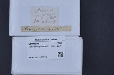 | Keywords: Naturalis Biodiversity Center - RMNH.MOL.135773 1 - Tectura virginea (Müller, 1776) - Lottiidae - Mollusc shell.jpeg artwork Dimensions artwork Document type Lottiidae Tectura Individual count Infraspecific epithet Infraspecific rank Institution Naturalis Kind of unit artwork Kind of unit specimen shell Life stage Medium artwork Nomenclatural code Source institute Leiden Scale the width of the text on the species/QR-code label is 38 mm Occurrence ID page Other fields Other versions artwork Permission license Naturalis donation CC-0 Mollusca Publication location Scientific name Tectura virginea Müller 1776 Scientific name authorship Müller 1776 Source url http //bioportal naturalis nl Specific epithet virginea State or province Subject keywords artwork Subject keywords publication Title artwork Title publication Type status Uploaded with GWToolset Naturalis_Biodiversity_Center_-_RMNH MOL 135773_1_-_Tectura_virginea_ Müller _1776 _-_Lottiidae_-_Mollusc_shell http //medialib naturalis nl/file/id/RMNH MOL 135773_1/format/large Molluscs at Naturalis from the Rijksmuseum van Natuurlijke Historie Media donated by Naturalis Biodiversity Center Tectura virginea |