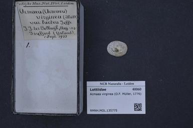 | Keywords: Naturalis Biodiversity Center - RMNH.MOL.135775 - Tectura virginea (Müller, 1776) - Lottiidae - Mollusc shell.jpeg artwork Dimensions artwork Document type Lottiidae Tectura Individual count Infraspecific epithet Infraspecific rank Institution Naturalis Kind of unit artwork Kind of unit specimen shell Life stage Medium artwork Nomenclatural code Source institute Leiden Scale the width of the text on the species/QR-code label is 38 mm Occurrence ID page Other fields Other versions artwork Permission license Naturalis donation CC-0 Mollusca Publication location Scientific name Tectura virginea Müller 1776 Scientific name authorship Müller 1776 Source url http //bioportal naturalis nl Specific epithet virginea State or province Subject keywords artwork Subject keywords publication Title artwork Title publication Type status Uploaded with GWToolset Naturalis_Biodiversity_Center_-_RMNH MOL 135775_-_Tectura_virginea_ Müller _1776 _-_Lottiidae_-_Mollusc_shell http //medialib naturalis nl/file/id/RMNH MOL 135775/format/large Molluscs at Naturalis from the Rijksmuseum van Natuurlijke Historie Media donated by Naturalis Biodiversity Center Tectura virginea |