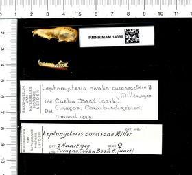 | Keywords: Naturalis Biodiversity Center - RMNH.MAM.14398 lat - Leptonycteris curasoae - skull.jpeg artwork Dimensions artwork Document type Leptonycteris Individual count 1 Infraspecific epithet Infraspecific rank Institution Naturalis Kind of unit artwork Kind of unit specimen skull Life stage Cueba Bosá dark Curaçao Caraibischgebied Medium artwork Nomenclatural code Occurrence ID page Other fields Other versions artwork Permission license Naturalis donation CC-0 Publication location Scientific name Leptonycteris curasoae Scientific name authorship female Source url http //bioportal naturalis nl Specific epithet curasoae State or province Subject keywords artwork Subject keywords publication Title artwork Title publication Type status Uploaded with GWToolset Naturalis_Biodiversity_Center_-_RMNH MAM 14398_lat_-_Leptonycteris_curasoae_-_skull http //medialib naturalis nl/file/id/RMNH MAM 14398_lat/format/large Media donated by Naturalis Biodiversity Center Mammals at Naturalis from the Rijksmuseum van Natuurlijke Historie Leptonycteris curasoae Leptonycteris |