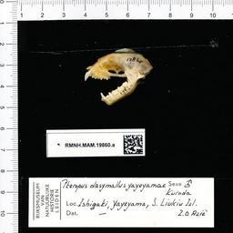 | Keywords: Naturalis Biodiversity Center - RMNH.MAM.19860.a lat - Pteropus dasymallus yayeyamae - skull.jpeg artwork Dimensions artwork Document type Pteropus Individual count 1 Infraspecific epithet yayeyamae Infraspecific rank Institution Naturalis Kind of unit artwork Kind of unit specimen skull Life stage Ishigaki Yayeyama S Liukiu Isl Z O Aziƫ Medium artwork Nomenclatural code Occurrence ID page Other fields Other versions artwork Permission license Naturalis donation CC-0 Publication location Scientific name Pteropus dasymallus yayeyamae Scientific name authorship male Source url http //bioportal naturalis nl Specific epithet dasymallus State or province Subject keywords artwork Subject keywords publication Title artwork Title publication Type status Uploaded with GWToolset Naturalis_Biodiversity_Center_-_RMNH MAM 19860 a_lat_-_Pteropus_dasymallus_yayeyamae_-_skull http //medialib naturalis nl/file/id/RMNH MAM 19860 a_lat/format/large Media donated by Naturalis Biodiversity Center Mammals at Naturalis from the Rijksmuseum van Natuurlijke Historie Pteropus dasymallus Pteropus |