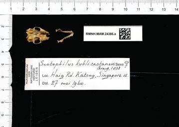 | Keywords: Naturalis Biodiversity Center - RMNH.MAM.24386.a pal - Scotophilus kuhlii castaneus - skull.jpeg artwork Dimensions artwork Document type Scotophilus Individual count 1 Infraspecific epithet castaneus Infraspecific rank Institution Naturalis Kind of unit artwork Kind of unit specimen skull Life stage Haig Rd Katong Singapore 15 Medium artwork Nomenclatural code Occurrence ID page Other fields Other versions artwork Permission license Naturalis donation CC-0 Publication location Scientific name Scotophilus kuhlii castaneus Scientific name authorship female Source url http //bioportal naturalis nl Specific epithet kuhlii State or province Subject keywords artwork Subject keywords publication Title artwork Title publication Type status Uploaded with GWToolset Naturalis_Biodiversity_Center_-_RMNH MAM 24386 a_pal_-_Scotophilus_kuhlii_castaneus_-_skull http //medialib naturalis nl/file/id/RMNH MAM 24386 a_pal/format/large Media donated by Naturalis Biodiversity Center Mammals at Naturalis from the Rijksmuseum van Natuurlijke Historie Scotophilus kuhlii |