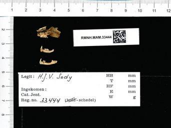| Keywords: Naturalis Biodiversity Center - RMNH.MAM.33444 pal - Chaerephon plicatus - skull.jpeg artwork Dimensions artwork Document type Chaerephon Individual count 1 Infraspecific epithet Infraspecific rank Institution Naturalis Kind of unit artwork Kind of unit specimen skull Life stage Dramaga 10 km Z v Buitenzorg W Java Indonesia Medium artwork Nomenclatural code Occurrence ID page Other fields Other versions artwork Permission license Naturalis donation CC-0 Publication location Scientific name Chaerephon plicatus Scientific name authorship Source url http //bioportal naturalis nl Specific epithet plicatus State or province Subject keywords artwork Subject keywords publication Title artwork Title publication Type status Uploaded with GWToolset Naturalis_Biodiversity_Center_-_RMNH MAM 33444_pal_-_Chaerephon_plicatus_-_skull http //medialib naturalis nl/file/id/RMNH MAM 33444_pal/format/large Media donated by Naturalis Biodiversity Center Mammals at Naturalis from the Rijksmuseum van Natuurlijke Historie Chaerephon plicatus |