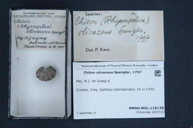 | Keywords: Naturalis Biodiversity Center - RMNH.MOL.116128 - Chiton olivaceus Spengler, 1797 - Chitonidae - Mollusc shell.jpeg artwork Dimensions artwork Document type Chitonidae Chiton Individual count Infraspecific epithet Infraspecific rank Institution Naturalis Kind of unit artwork Kind of unit specimen shell Life stage Croatia Cres Splitsko-Dalmatinska; 16 vi 1930 Medium artwork Nomenclatural code Source institute Leiden Scale the width of the text on the species/QR-code label is 38 mm Occurrence ID page Other fields Other versions artwork Permission license Naturalis donation CC-0 Mollusca Publication location Scientific name Chiton olivaceus Spengler 1797 Scientific name authorship Spengler 1797 Source url http //bioportal naturalis nl Specific epithet olivaceus State or province Splitsko-Dalmatinska Subject keywords artwork Subject keywords publication Title artwork Title publication Type status - Uploaded with GWToolset Naturalis_Biodiversity_Center_-_RMNH MOL 116128_-_Chiton_olivaceus_Spengler _1797_-_Chitonidae_-_Mollusc_shell http //medialib naturalis nl/file/id/RMNH MOL 116128/format/large Molluscs at Naturalis from the Rijksmuseum van Natuurlijke Historie Media donated by Naturalis Biodiversity Center Chiton genus Chiton olivaceus |