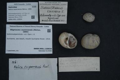 | Keywords: Naturalis Biodiversity Center - RMNH.MOL.120924 - Natica cayennensis Récluz, 1850 - Naticidae - Mollusc shell.jpeg artwork Dimensions artwork Document type Naticidae subfamily Naticinae Natica Individual count Infraspecific epithet Infraspecific rank Institution Naturalis Kind of unit artwork Kind of unit specimen shell Life stage Suriname sea beach mouth Suriname River; 1914 Medium artwork Nomenclatural code Source institute Leiden Scale the width of the text on the species/QR-code label is 38 mm Occurrence ID page Other fields Other versions artwork Permission license Naturalis donation CC-0 Mollusca Publication location Scientific name Natica cayennensis Récluz 1850 Scientific name authorship Récluz 1850 Source url http //bioportal naturalis nl Specific epithet cayennensis State or province Subject keywords artwork Subject keywords publication Title artwork Title publication Type status - Uploaded with GWToolset Naturalis_Biodiversity_Center_-_RMNH MOL 120924_-_Natica_cayennensis_Récluz _1850_-_Naticidae_-_Mollusc_shell http //medialib naturalis nl/file/id/RMNH MOL 120924/format/large Molluscs at Naturalis from the Rijksmuseum van Natuurlijke Historie Media donated by Naturalis Biodiversity Center Natica Natica cayennensis |