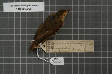 | Keywords: Naturalis Biodiversity Center - RMNH.AVES.135685 1 - Sericornis nouhuysi cantans Mayr, 1930 - Acanthizidae - bird skin specimen.jpeg artwork Dimensions artwork Document type Acanthizidae Sericornis Individual count 1 Infraspecific epithet cantans Infraspecific rank Institution Naturalis Kind of unit artwork Kind of unit specimen skin Life stage Indonesia N W Nieuw Guinea Karon geb Medium artwork Nomenclatural code Occurrence ID page Other fields Other versions artwork Permission license Naturalis donation CC-0 Publication location Scientific name Sericornis nouhuysi cantans Mayr 1930 Scientific name authorship Mayr 1930 female Source url http //bioportal naturalis nl Specific epithet nouhuysi State or province N W Nieuw Guinea Karon geb Subject keywords artwork Subject keywords publication Title artwork Title publication Type status Uploaded with GWToolset Naturalis_Biodiversity_Center_-_RMNH AVES 135685_1_-_Sericornis_nouhuysi_cantans_Mayr _1930_-_Acanthizidae_-_bird_skin_specimen http //medialib naturalis nl/file/id/RMNH AVES 135685_1/format/large Media donated by Naturalis Biodiversity Center Songbird specimens at Naturalis Biodiversity Center Sericornis nouhuysi |