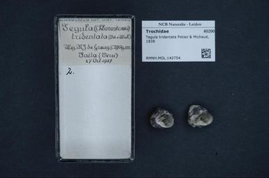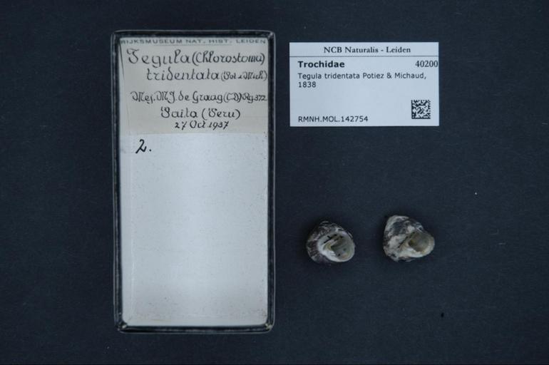 | Keywords: Naturalis Biodiversity Center - RMNH.MOL.142754 - Tegula tridentata (Potiez & Michaud, 1838) - Turbinidae - Mollusc shell.jpeg artwork Dimensions artwork Document type Turbinidae Tegula Individual count Infraspecific epithet Infraspecific rank Institution Naturalis Kind of unit artwork Kind of unit specimen shell Life stage Medium artwork Nomenclatural code Source institute Leiden Scale the width of the text on the species/QR-code label is 38 mm Occurrence ID page Other fields Other versions artwork Permission license Naturalis donation CC-0 Mollusca Publication location Scientific name Tegula tridentata Potiez Michaud 1838 Scientific name authorship Potiez Michaud 1838 Source url http //bioportal naturalis nl Specific epithet tridentata State or province Subject keywords artwork Subject keywords publication Title artwork Title publication Type status Uploaded with GWToolset Naturalis_Biodiversity_Center_-_RMNH MOL 142754_-_Tegula_tridentata_ Potiez_ _Michaud _1838 _-_Turbinidae_-_Mollusc_shell http //medialib naturalis nl/file/id/RMNH MOL 142754/format/large Molluscs at Naturalis from the Rijksmuseum van Natuurlijke Historie Media donated by Naturalis Biodiversity Center Tegula Tegula tridentata |