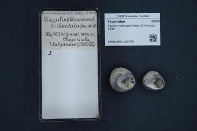| Keywords: Naturalis Biodiversity Center - RMNH.MOL.142759 - Tegula tridentata (Potiez & Michaud, 1838) - Turbinidae - Mollusc shell.jpeg artwork Dimensions artwork Document type Turbinidae Tegula Individual count Infraspecific epithet Infraspecific rank Institution Naturalis Kind of unit artwork Kind of unit specimen shell Life stage Medium artwork Nomenclatural code Source institute Leiden Scale the width of the text on the species/QR-code label is 38 mm Occurrence ID page Other fields Other versions artwork Permission license Naturalis donation CC-0 Mollusca Publication location Scientific name Tegula tridentata Potiez Michaud 1838 Scientific name authorship Potiez Michaud 1838 Source url http //bioportal naturalis nl Specific epithet tridentata State or province Subject keywords artwork Subject keywords publication Title artwork Title publication Type status Uploaded with GWToolset Naturalis_Biodiversity_Center_-_RMNH MOL 142759_-_Tegula_tridentata_ Potiez_ _Michaud _1838 _-_Turbinidae_-_Mollusc_shell http //medialib naturalis nl/file/id/RMNH MOL 142759/format/large Molluscs at Naturalis from the Rijksmuseum van Natuurlijke Historie Media donated by Naturalis Biodiversity Center Tegula Tegula tridentata |