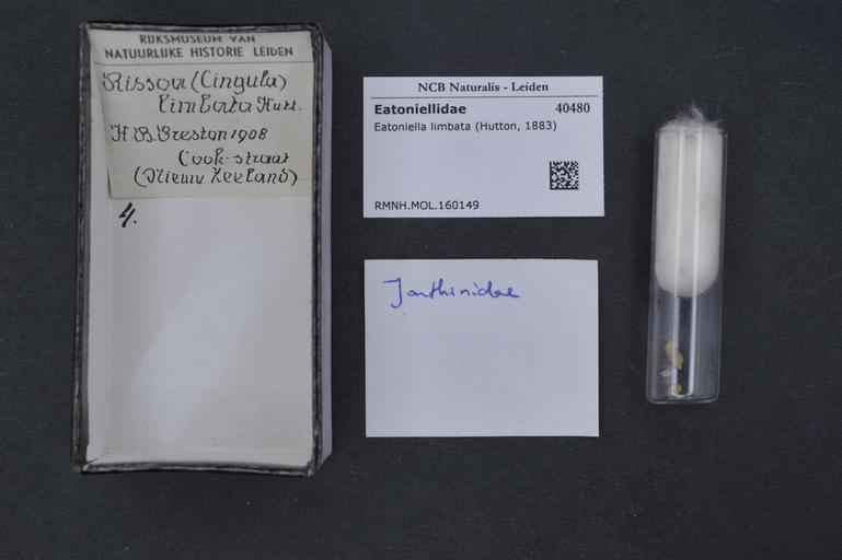 | Keywords: Naturalis Biodiversity Center - RMNH.MOL.160149 1 - Eatoniella limbata (Hutton, 1883) - Eatoniellidae - Mollusc shell.jpeg artwork Dimensions artwork Document type Eatoniellidae Eatoniella Individual count Infraspecific epithet Infraspecific rank Institution Naturalis Kind of unit artwork Kind of unit specimen shell Life stage Medium artwork Nomenclatural code Scale the width of the text on the species/QR-code label is 38 mm Occurrence ID page Other fields Other versions artwork Permission license Naturalis donation CC-0 Mollusca Publication location Scientific name Eatoniella limbata Hutton 1883 Scientific name authorship Hutton 1883 Source url http //bioportal naturalis nl Specific epithet limbata State or province Subject keywords artwork Subject keywords publication Title artwork Title publication Type status Uploaded with GWToolset Naturalis_Biodiversity_Center_-_RMNH MOL 160149_1_-_Eatoniella_limbata_ Hutton _1883 _-_Eatoniellidae_-_Mollusc_shell http //medialib naturalis nl/file/id/RMNH MOL 160149_1/format/large Media donated by Naturalis Biodiversity Center Molluscs at Naturalis from the Rijksmuseum van Natuurlijke Historie Eatoniella limbata Eatoniella |