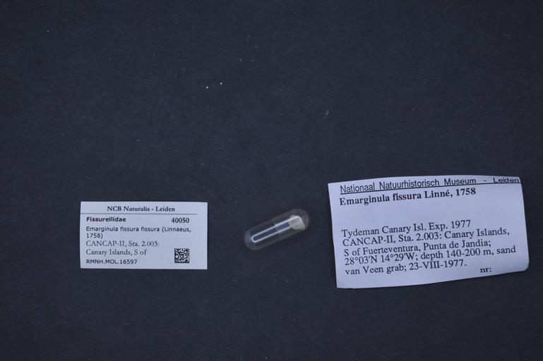 Keywords: Naturalis Biodiversity Center - RMNH.MOL.16597 - Emarginula fissura (Linnaeus, 1758) - Fissurellidae - Mollusc shell.jpeg artwork Dimensions artwork Document type Fissurellidae subfamily Emarginulinae Emarginula J Goud/ M Lavalije Individual count Infraspecific epithet Infraspecific rank Institution Naturalis Kind of unit artwork Kind of unit specimen shell Life stage CANCAP-II Sta 2 003 Canary Islands S of Fuerteventura Punta de Jandia; 28°03'N 14°29'W; depth 140-200 m sand; van Veen grab; 23 viii 1977 Medium artwork Nomenclatural code Source institute Leiden Scale the width of the text on the species/QR-code label is 38 mm Occurrence ID page Other fields Other versions artwork Permission license Naturalis donation CC-0 Mollusca Publication location Scientific name Emarginula fissura Linnaeus 1758 Scientific name authorship Linnaeus 1758 Source url http //bioportal naturalis nl Specific epithet fissura State or province Canary Islands Subject keywords artwork Subject keywords publication Title artwork Title publication Type status Uploaded with GWToolset Naturalis_Biodiversity_Center_-_RMNH MOL 16597_-_Emarginula_fissura_ Linnaeus _1758 _-_Fissurellidae_-_Mollusc_shell http //medialib naturalis nl/file/id/RMNH MOL 16597/format/large Media donated by Naturalis Biodiversity Center Molluscs at Naturalis from the Rijksmuseum van Natuurlijke Historie Emarginula fissura Emarginula |