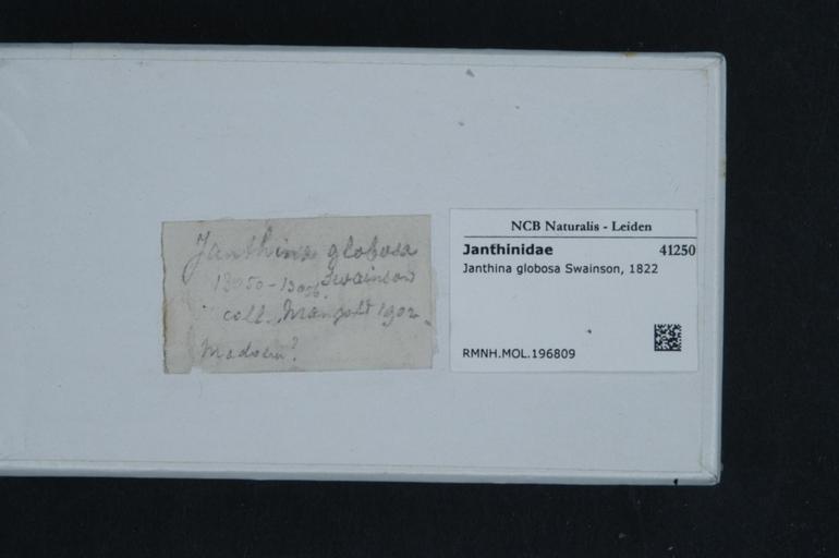 | Keywords: Naturalis Biodiversity Center - RMNH.MOL.196809 1 - Janthina globosa Swainson, 1822 - Janthinidae - Mollusc shell.jpeg artwork Dimensions artwork Document type Janthinidae Janthina Individual count Infraspecific epithet Infraspecific rank Institution Naturalis Kind of unit artwork Kind of unit specimen shell Life stage Medium artwork Nomenclatural code Source institute Rijksmuseum van Natuurlijke Historie Leiden Scale the width of the text on the species/QR-code label is 38 mm Occurrence ID page Other fields Other versions artwork Permission license Naturalis donation CC-0 Mollusca Publication location Scientific name Janthina globosa Swainson 1822 Scientific name authorship Swainson 1822 Source url http //bioportal naturalis nl Specific epithet globosa State or province Subject keywords artwork Subject keywords publication Title artwork Title publication Type status Uploaded with GWToolset Naturalis_Biodiversity_Center_-_RMNH MOL 196809_1_-_Janthina_globosa_Swainson _1822_-_Janthinidae_-_Mollusc_shell http //medialib naturalis nl/file/id/RMNH MOL 196809_1/format/large Media donated by Naturalis Biodiversity Center Molluscs at Naturalis from the Rijksmuseum van Natuurlijke Historie Janthina globosa |