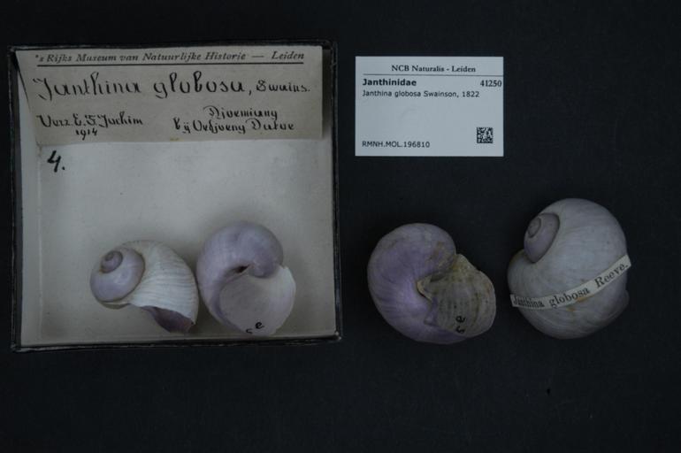| Keywords: Naturalis Biodiversity Center - RMNH.MOL.196810 - Janthina globosa Swainson, 1822 - Janthinidae - Mollusc shell.jpeg artwork Dimensions artwork Document type Janthinidae Janthina Individual count Infraspecific epithet Infraspecific rank Institution Naturalis Kind of unit artwork Kind of unit specimen shell Life stage Medium artwork Nomenclatural code Source institute Rijksmuseum van Natuurlijke Historie Leiden Scale the width of the text on the species/QR-code label is 38 mm Occurrence ID page Other fields Other versions artwork Permission license Naturalis donation CC-0 Mollusca Publication location Scientific name Janthina globosa Swainson 1822 Scientific name authorship Swainson 1822 Source url http //bioportal naturalis nl Specific epithet globosa State or province Subject keywords artwork Subject keywords publication Title artwork Title publication Type status Uploaded with GWToolset Naturalis_Biodiversity_Center_-_RMNH MOL 196810_-_Janthina_globosa_Swainson _1822_-_Janthinidae_-_Mollusc_shell http //medialib naturalis nl/file/id/RMNH MOL 196810/format/large Media donated by Naturalis Biodiversity Center Molluscs at Naturalis from the Rijksmuseum van Natuurlijke Historie Janthina globosa |