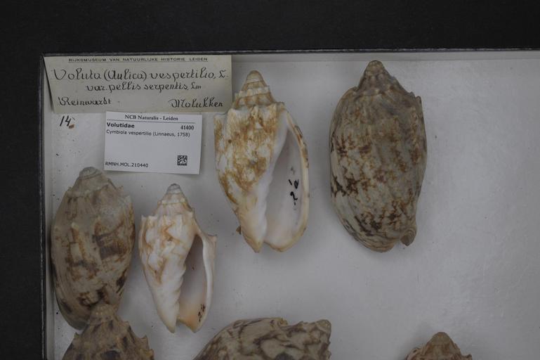 | Keywords: Naturalis Biodiversity Center - RMNH.MOL.210440 - Cymbiola vespertilio Linnaeus, 1758 - Volutidae - Mollusc shell.jpeg artwork Dimensions artwork Document type Volutidae Cymbiola Individual count Infraspecific epithet Infraspecific rank Institution Naturalis Kind of unit artwork Kind of unit specimen shell Life stage Medium artwork Nomenclatural code Source institute Rijksmuseum van Natuurlijke Historie Leiden Scale the width of the text on the species/QR-code label is 38 mm Occurrence ID page Neogastropoda Other fields Other versions artwork Permission license Naturalis donation CC-0 Mollusca Publication location Scientific name Cymbiola vespertilio Linnaeus 1758 Scientific name authorship Linnaeus 1758 Source url http //bioportal naturalis nl Specific epithet vespertilio State or province Subject keywords artwork Subject keywords publication Title artwork Title publication Type status Uploaded with GWToolset Naturalis_Biodiversity_Center_-_RMNH MOL 210440_-_Cymbiola_vespertilio_Linnaeus _1758_-_Volutidae_-_Mollusc_shell http //medialib naturalis nl/file/id/RMNH MOL 210440/format/large Media donated by Naturalis Biodiversity Center Molluscs at Naturalis from the Rijksmuseum van Natuurlijke Historie Cymbiola vespertilio Cymbiola |