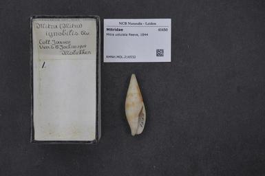 | Keywords: Naturalis Biodiversity Center - RMNH.MOL.216532 - Mitra ustulata Reeve, 1844 - Mitridae - Mollusc shell.jpeg artwork Dimensions artwork Document type Mitridae subfamily Mitrinae Mitra Individual count Infraspecific epithet Infraspecific rank Institution Naturalis Kind of unit artwork Kind of unit specimen shell Life stage Medium artwork Nomenclatural code Source institute Rijksmuseum van Natuurlijke Historie Leiden Scale the width of the text on the species/QR-code label is 38 mm Occurrence ID page Neogastropoda Other fields Other versions artwork Permission license Naturalis donation CC-0 Mollusca Publication location Scientific name Mitra ustulata Reeve 1844 Scientific name authorship Reeve 1844 Source url http //bioportal naturalis nl Specific epithet ustulata State or province Subject keywords artwork Subject keywords publication Title artwork Title publication Type status Uploaded with GWToolset Naturalis_Biodiversity_Center_-_RMNH MOL 216532_-_Mitra_ustulata_Reeve _1844_-_Mitridae_-_Mollusc_shell http //medialib naturalis nl/file/id/RMNH MOL 216532/format/large Media donated by Naturalis Biodiversity Center Molluscs at Naturalis from the Rijksmuseum van Natuurlijke Historie Mitra ustulata Mitra |