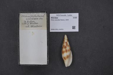 | Keywords: Naturalis Biodiversity Center - RMNH.MOL.216531 - Mitra ustulata Reeve, 1844 - Mitridae - Mollusc shell.jpeg artwork Dimensions artwork Document type Mitridae subfamily Mitrinae Mitra Individual count Infraspecific epithet Infraspecific rank Institution Naturalis Kind of unit artwork Kind of unit specimen shell Life stage Medium artwork Nomenclatural code Source institute Rijksmuseum van Natuurlijke Historie Leiden Scale the width of the text on the species/QR-code label is 38 mm Occurrence ID page Neogastropoda Other fields Other versions artwork Permission license Naturalis donation CC-0 Mollusca Publication location Scientific name Mitra ustulata Reeve 1844 Scientific name authorship Reeve 1844 Source url http //bioportal naturalis nl Specific epithet ustulata State or province Subject keywords artwork Subject keywords publication Title artwork Title publication Type status Uploaded with GWToolset Naturalis_Biodiversity_Center_-_RMNH MOL 216531_-_Mitra_ustulata_Reeve _1844_-_Mitridae_-_Mollusc_shell http //medialib naturalis nl/file/id/RMNH MOL 216531/format/large Media donated by Naturalis Biodiversity Center Molluscs at Naturalis from the Rijksmuseum van Natuurlijke Historie Mitra ustulata Mitra |